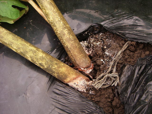 白絹病 株元に菌糸と菌核が見える