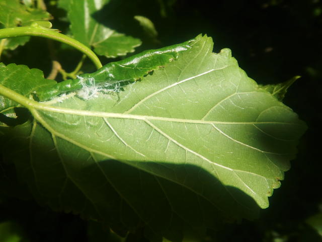 クワキジラミ 巻いた葉はロウ物質で閉じられる