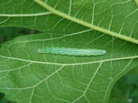 参考:スカシノメイガ幼虫は側面の黒点が左右に4つ。クワノメイガは多数。