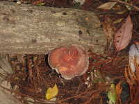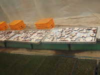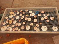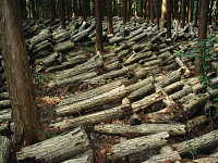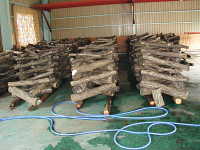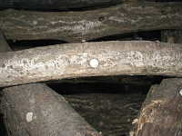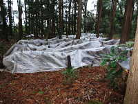 | 購入した原木に駒木(種菌)を打ち、2ヶ月ほどビニールシートで覆い、保温・保湿する。 シイタケ菌が原木内に蔓延するよう2ヶ月に1回、天地返しを行う。 種菌接種後250〜300日で、シイタケが発生できる準備が整う。(この状態を「ほだ木」という) |