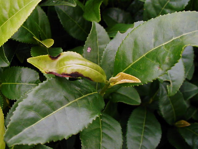 チャノミドリヒメヨコバイ 葉脈の褐変と葉縁の赤葉枯病の併発
