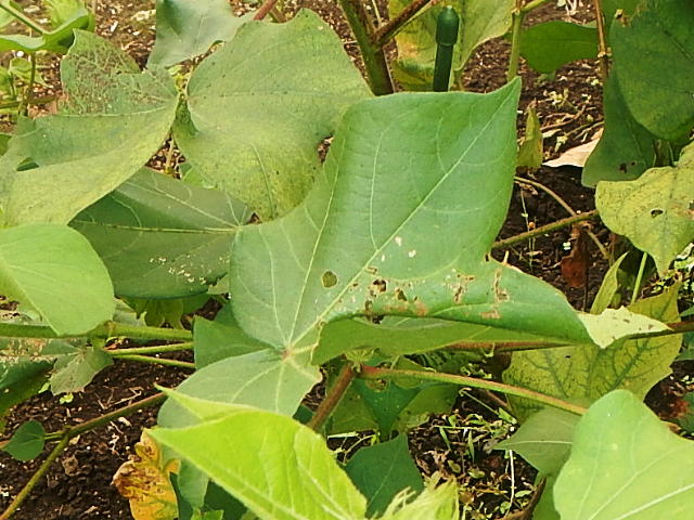 ワタノメイガ幼虫による巻葉(10月)