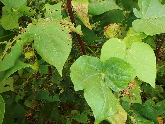 ワタノメイガ幼虫による巻葉(10月)