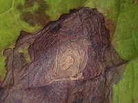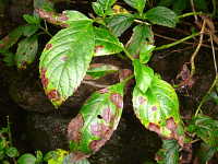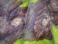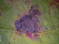 被害:葉に褐色の病斑を生じる。(同心円状で中心部がやや白い病斑)