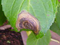被害:葉に輪紋状の病斑を生じる。(病斑内には褐色の小粒点が散生)