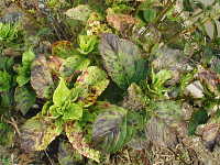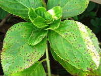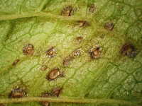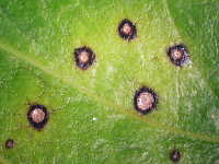 被害:葉に小円斑を多数生じる。(周縁紫褐色、内部灰褐色でやや陥没した病斑)