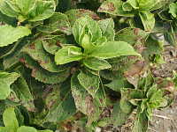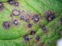 伝染方法:緑枝の病斑で越冬し、翌年雨滴の飛沫で伝染する。