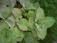 被害:葉にうどん粉状の病斑を生じる。 参考:やや乾燥した条件で発生しやすい。