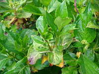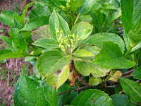 | 発生時期:6月 病原:ファイトプラズマ(特殊な細菌) 伝染方法:ヨコバイ類が媒介すると考えられている。 被害:蕾の異常(奇形化、小型化)、葉の赤化・貴化、株の衰弱。 |
