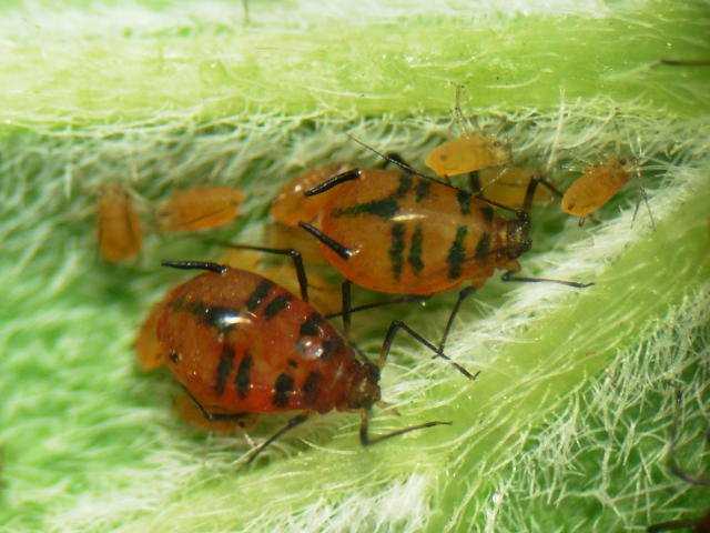 バイカウツギコブアブラムシ成虫(体長2.5mm)及び幼虫