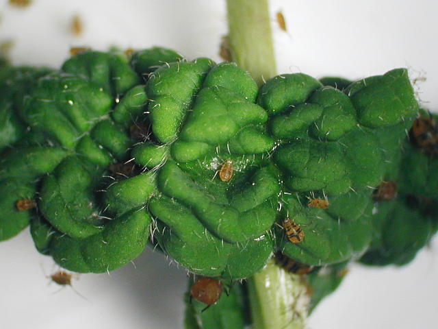 バイカウツギコブアブラムシ 寄生葉は巻葉となる