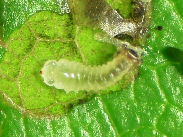 バラクロハモグリガ若齢幼虫(体長2.5mm)