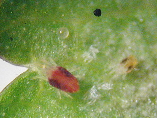 カンザワハダニ成虫(体長0.4mm)及び第1若虫(体長0.2mm)