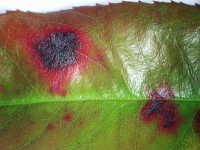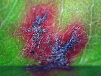 | 発生時期:5月〜7月 病原:糸状菌(かび) 伝染方法:病原菌は病枝上で越冬し、伝染源となり、主に雨滴の飛散で伝染する。 被害:葉に紫色のぼかし状病斑や、円形病斑を生じ、進展すると落葉や枝枯れを起こす。 参考:発生すると農薬では防除が難しく、枝枯れに進展することが多い。 |