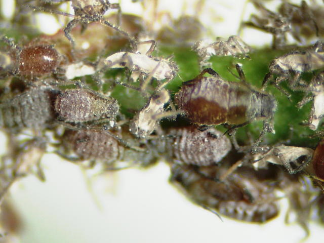 オカボアカアブラムシ成虫(体長2mm)及び幼虫