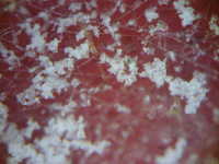 被害:葉にうどん粉状の白い病斑を生じる。