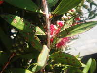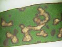 | 発生時期:4月〜5月 病原:糸状菌(かび) 伝染方法:土壌中に残った発病葉上の病原菌が伝染源となる。 被害:葉に円形〜不整形の周囲が褐色で内部が薄褐色又は白色の病斑を生じる。 |