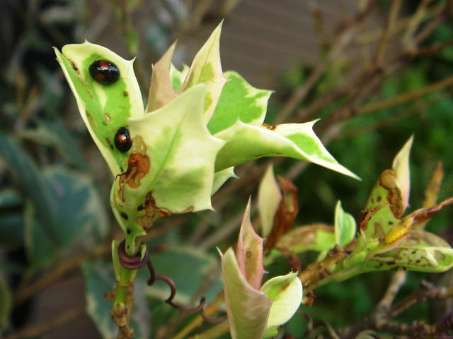 コメント:ヘリグロテントウノミハムシ 成虫による被害葉(7月)