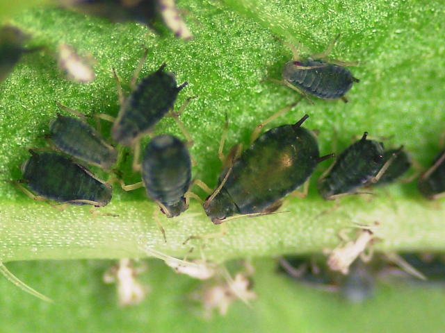 ワタアブラムシ成虫(体長1.8mm)及び幼虫