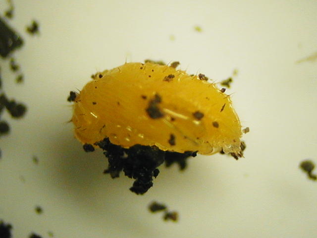 コメント:ヘリグロテントウノミハムシ蛹(体長3.5mm)