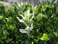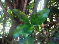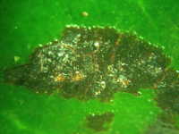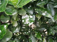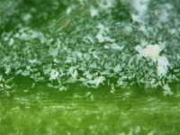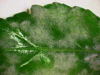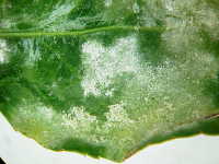 | 発生時期:4月〜6月 伝染方法:発病葉上の病原菌が伝染源となる。 被害:葉にうどん粉状の病斑を生じる。古い病斑は寄生菌のために次第に黒色になる。 参考:やや乾燥した条件で発生しやすい。 |
