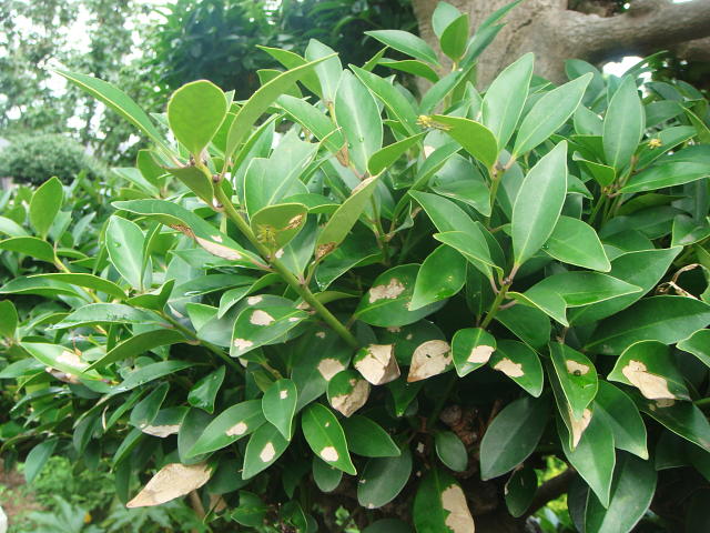 ヒロヘリアオイラガ中齢幼虫による被害葉