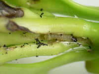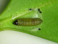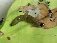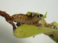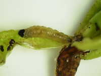 | 発生時期:4月〜6月 被害:幼虫による葉の食害 参考:幼虫は葉を綴って、その中で食害する。 |
