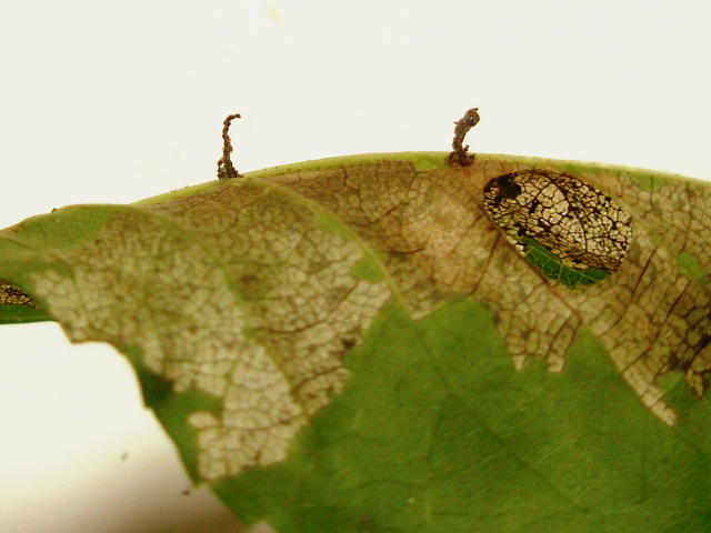 ムラサキシキブツツヒメハマキ幼虫の葉裏のはしご状のかくれ場所