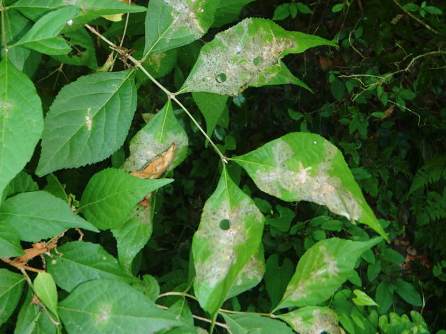 ムラサキシキブツツヒメハマキ幼虫による食害葉