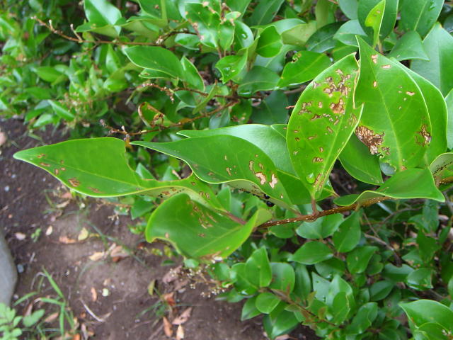 ヘリグロテントウノミハムシ成虫による被害葉(6月下旬)
