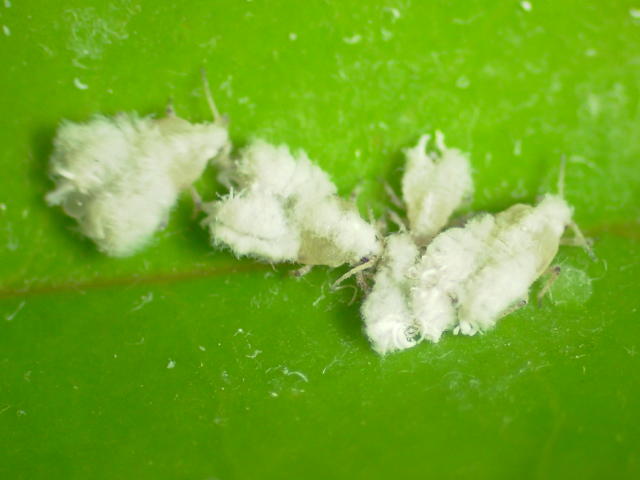 トウネズミモチハマキワタムシ成虫(体長4mm)及び幼虫