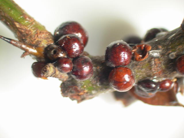 タマカタカイガラムシ成虫(体長4mm)及び幼虫(体長2.5mm)
