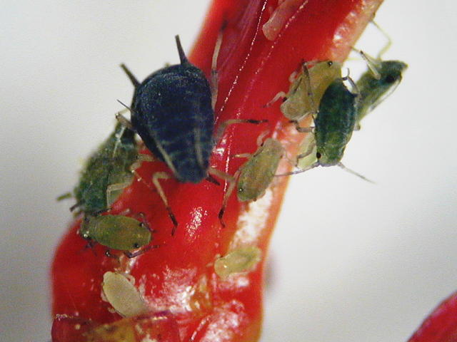 ワタアブラムシ成虫(体長1.5mm)及び幼虫