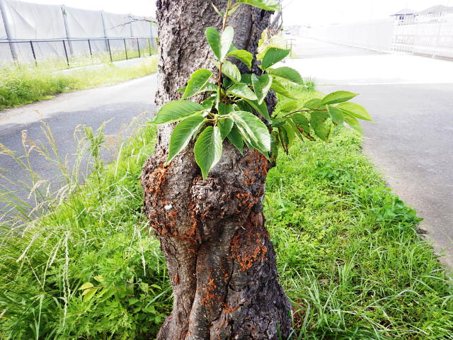 クビアカツヤカミキリ サクラ樹から赤茶色のフラス(糞と木くずが混ざったもの)が出る