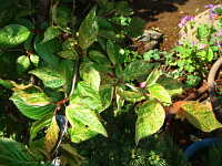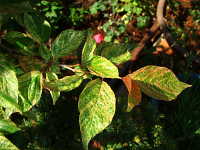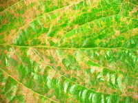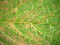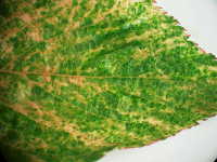 | 発生時期:4月 病原:ウイルス 伝染方法:接ぎ木により伝染する。 被害:葉脈が黄化して網のように見える。病徴が現れるのは一部の葉のみである。 |