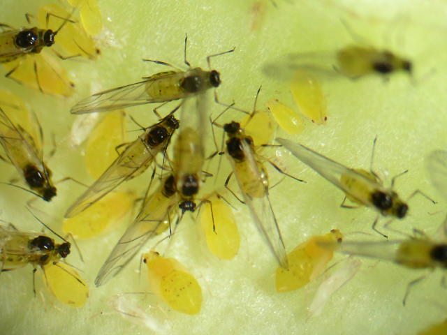 サクラフシアブラムシ成虫(有翅・無翅とも、体長1.5mm)