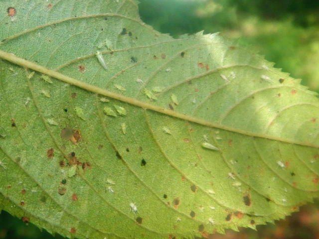 モモヒメヨコバイ 葉裏の成虫・幼虫のコロニー