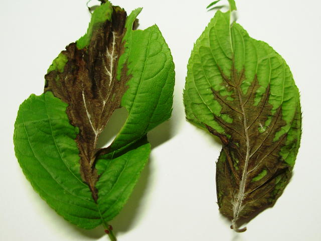 幼果菌核病 葉表(左)と葉裏(右)の葉脈に沿った白い分生子塊