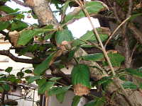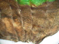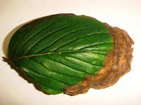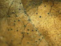 被害:葉に褐色の不整形病斑を生じ、病斑上には黒色小粒点を生じる。