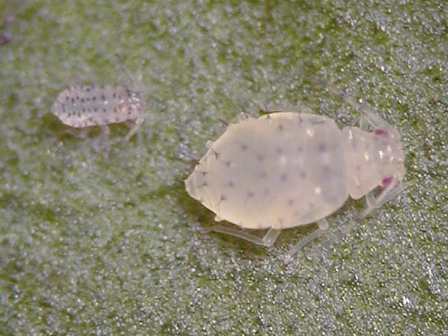サルスベリヒゲマダラアブラムシ成虫(体長1.2mm)及び幼虫(0.5mm)