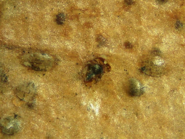 すす葉枯病 黒色小点は中央が盛り上がり、つつくと表面が剥がれる