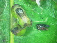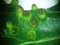被害:葉表に緑色〜黒色の虫コブを生じて見栄えが悪くなる。虫コブ内の幼虫による吸汁害。