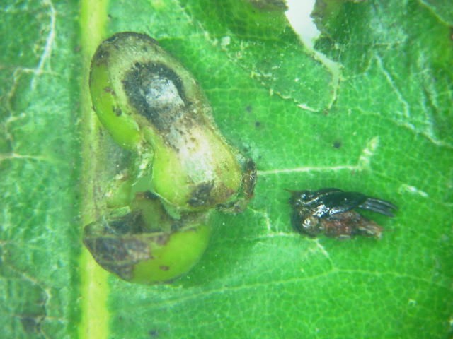虫コブを割るとシロダモタマバエ蛹が出てきた
