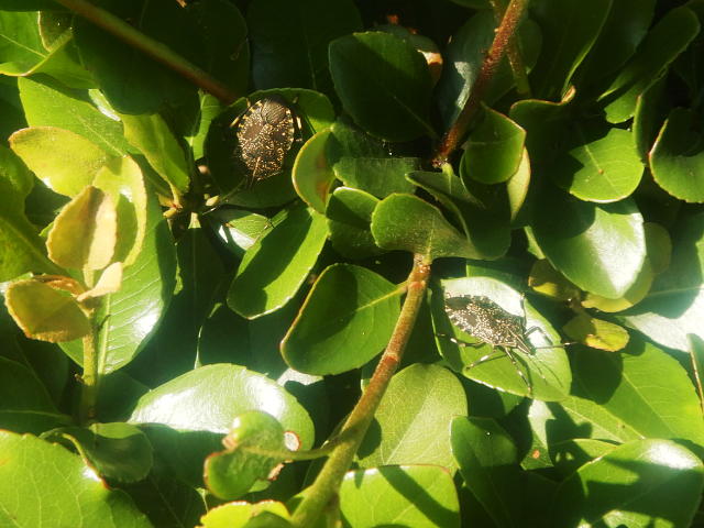 キマダラカメムシ成虫が葉に集まる