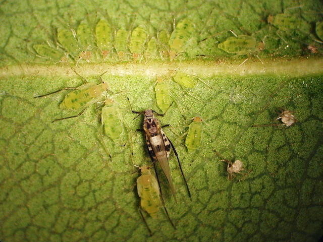 ナシミドリオオアブラムシ有翅成虫(体長3mm)及び幼虫