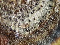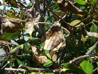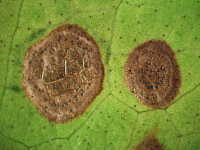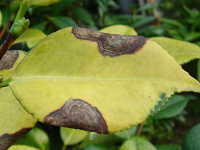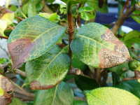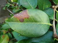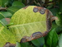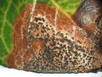 被害:暗褐色の病斑を生じ、病斑には小黒点を多数生じる。病葉は樹上に長期間留まる。
