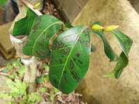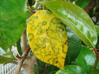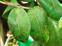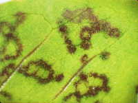 被害:病葉は黄化して緑色の輪紋を生じ、又は茶褐色輪紋を生じ、早期に落葉する。