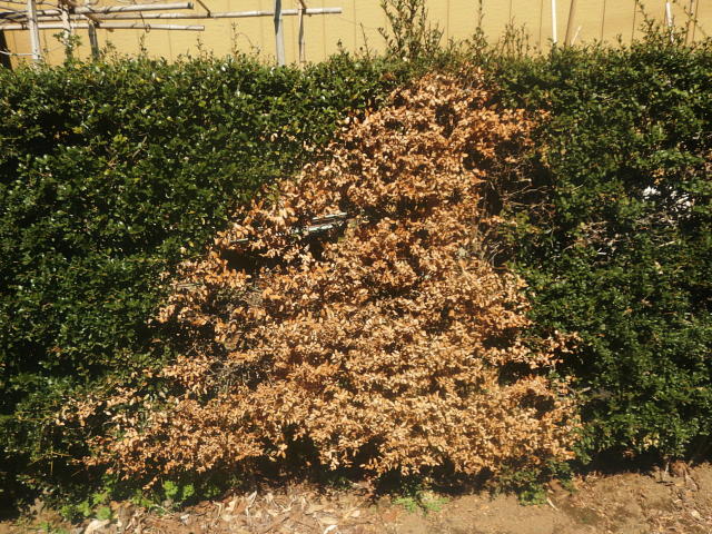 枝枯病 生け垣が大きく枯れ込む(3月下旬)