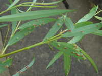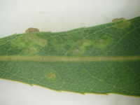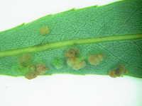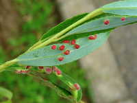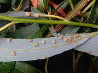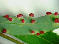 | 発生時期:6月〜9月 被害:フシダニによる葉の虫コブ。フシダニは橙色で体長0.2mmと小さい。 |