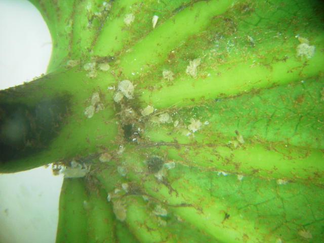 ヤツデキジラミ若齢・中齢幼虫のコロニー(4月中旬)